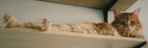 One of his favorite sleeping places is shown in the picture. From this vantage point he can easily oversee me working on the computer, and still take a nap every now and then.